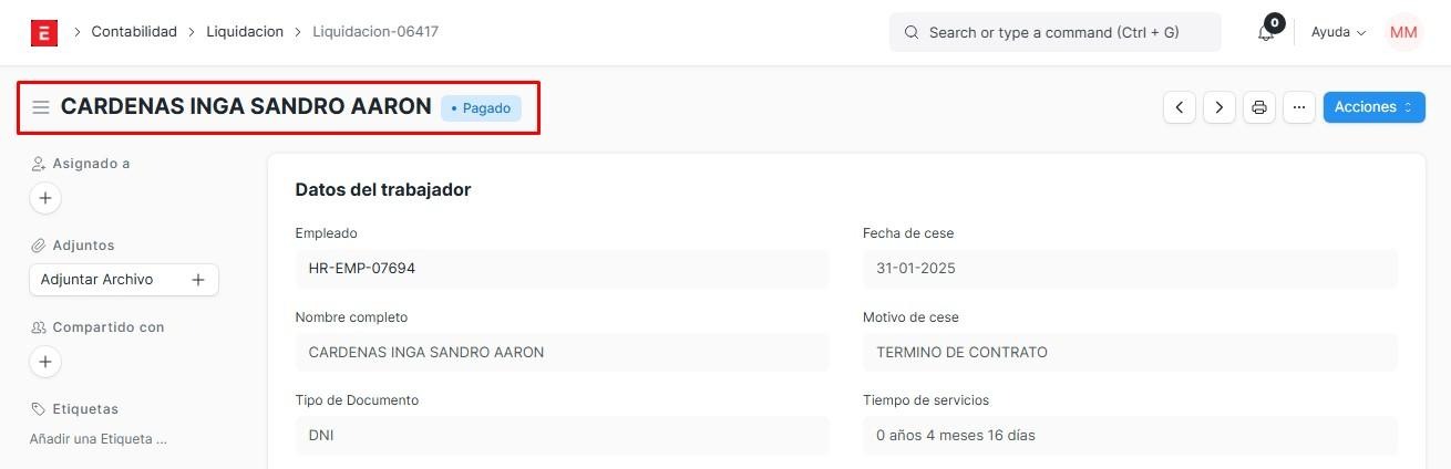Una vez pagado saldrá de la siguiente manera en el apartado liquidación.