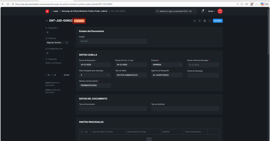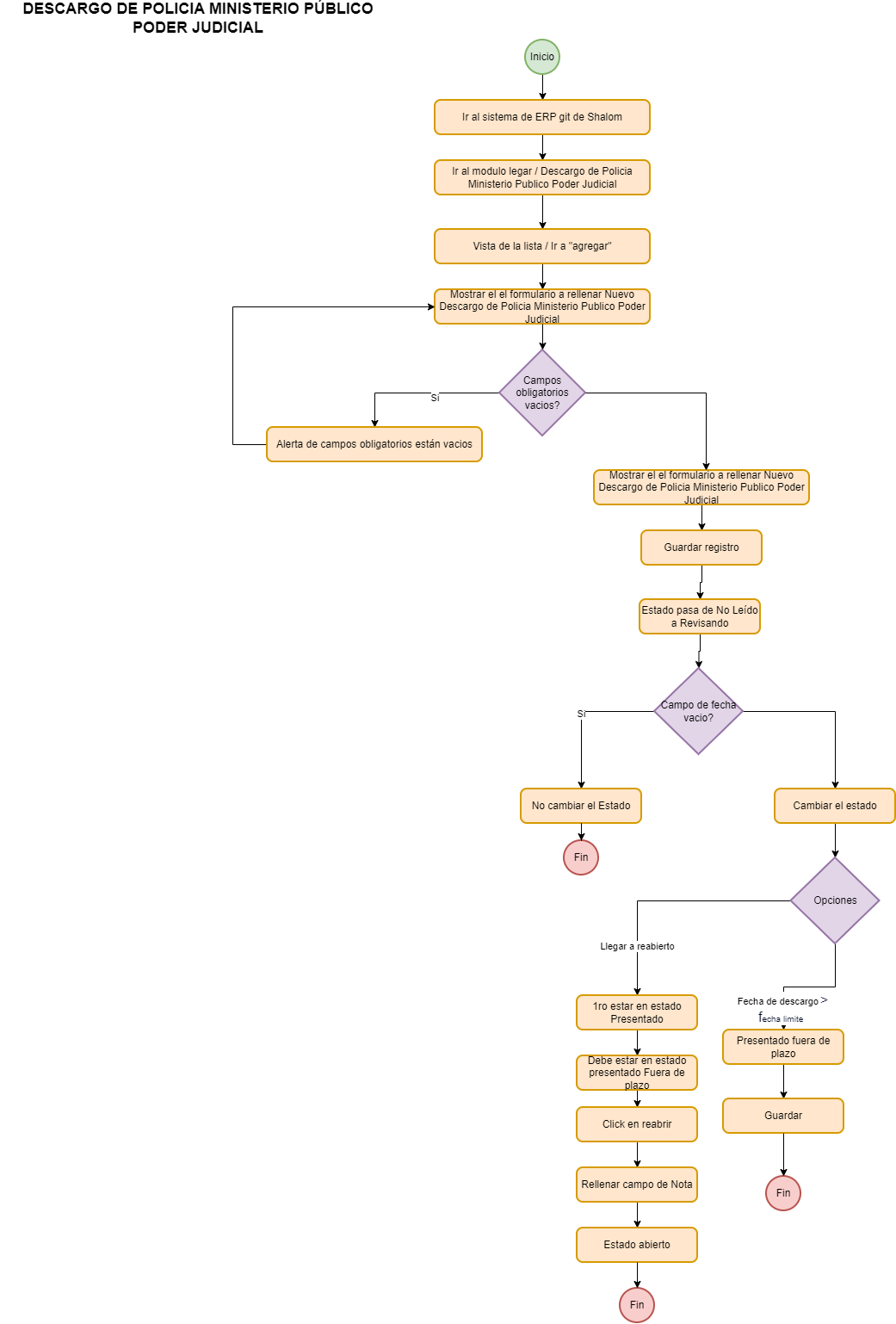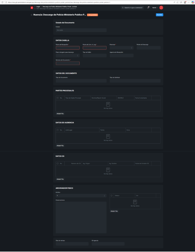 Este documento sirve como guía oficial para los colaboradores encargados de la creación de registros en el apartado Descargo De Policía Ministerio Publico Poder Judicial dentro del ERP.