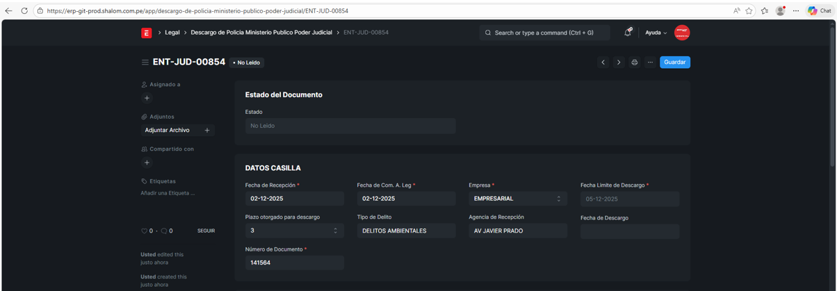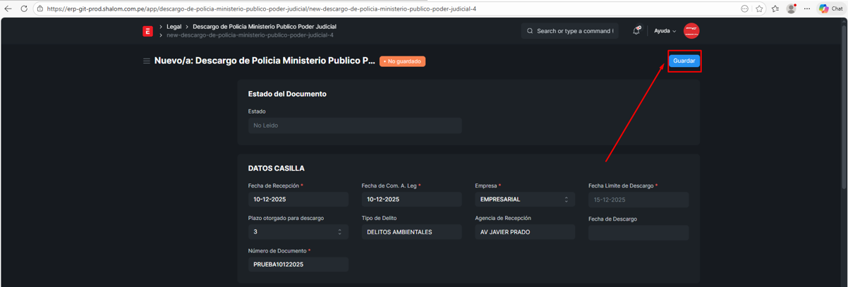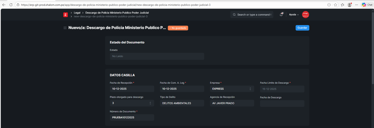 NOTA: Se recomienda no llenar el campo fecha de descargo desde la creación del registro – Ya que al realizar el QA de una tarea relacionada se quedo como recomendación que este campo aparezca después de hacer el guardado del nuevo registro, ya que al ser llenado al inicio se queda el estado del registro en “No leido” y no cambia según el flujo