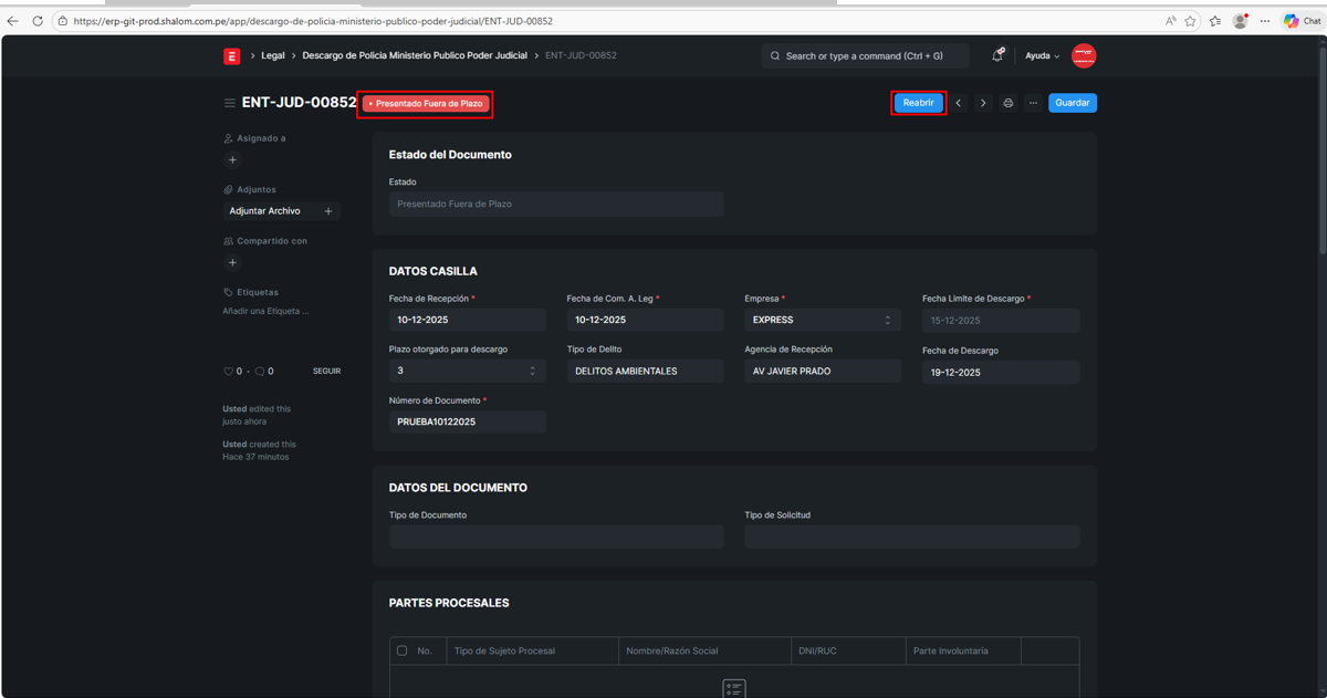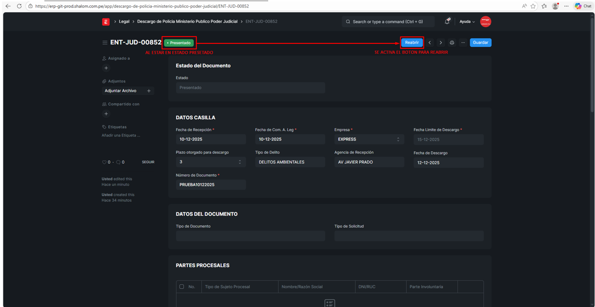 ▪ Reabierto → Cuando paso por el estado Presentado o Presentado Fuera de Plazo y se le da como acción a “Re-abrir”