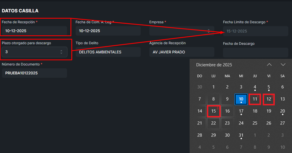 ▪ Ejemplo: Se selecciona como “fecha de recepción” el día 10-12-2025 y como “Plazo otorgado para descargo” el valor de 3 días de plazo, se empieza con el conteo desde el día 11-12-2025 (1) siendo el primer día, 12-12-2025 (2), 13-12-2025 (No se cuenta - sábado), 14-12-2025 (No se cuenta-Domingo), 15-12-2025 (3), mostrando esta fecha en el campo “Fecha Límite de Descargo”