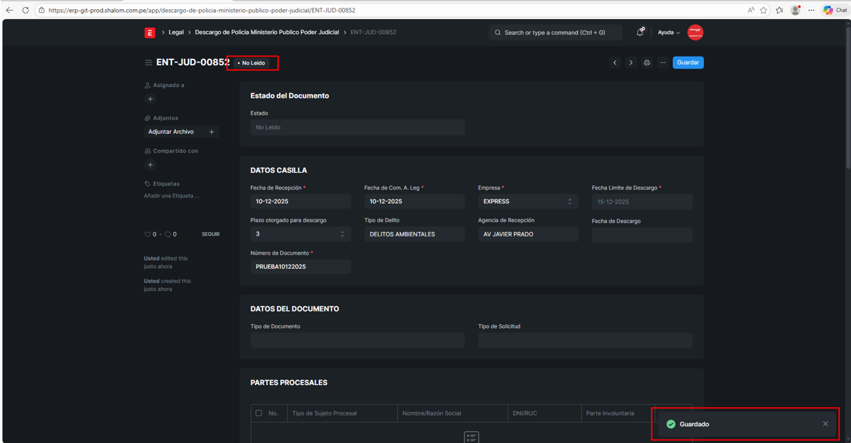 6. Al guardar de manera inicial se muestra en estado “no leído”