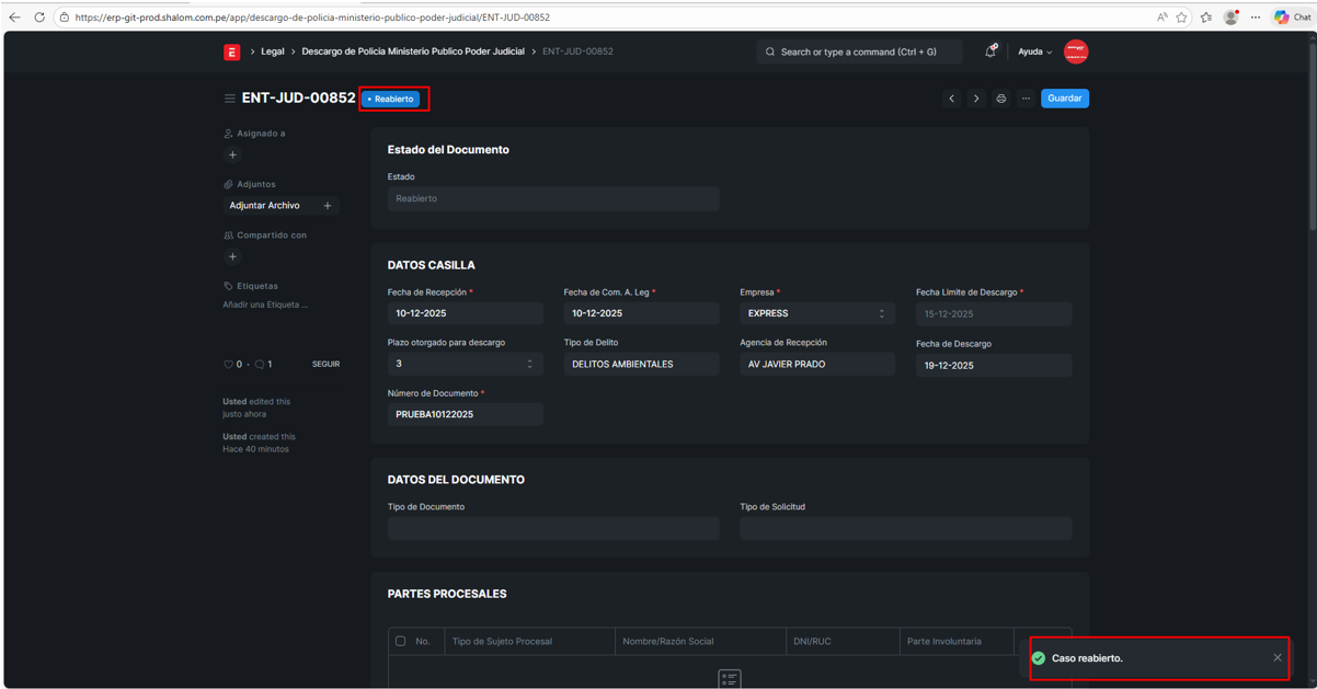 1.1.2.2. Al darle al botón reabrir podemos observar que se re-abrio correctamente