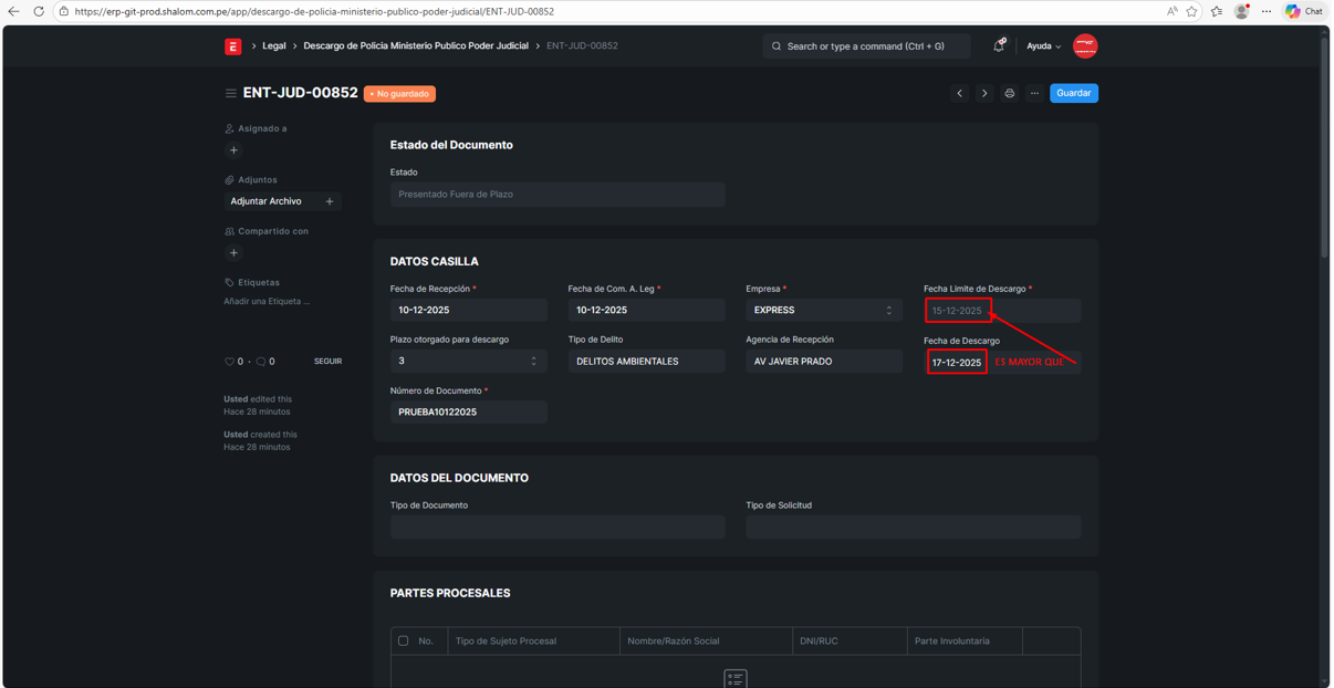 12.Para que se cumpla el flujo de para llegar a Fuera de plazo, la fecha actual debe ser mayor a la fecha límite de descargo.