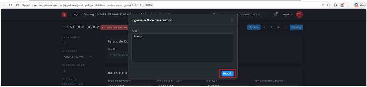 1.1.2.1. Al darle al botón Re-abrir se abre un campo para agregar una nota