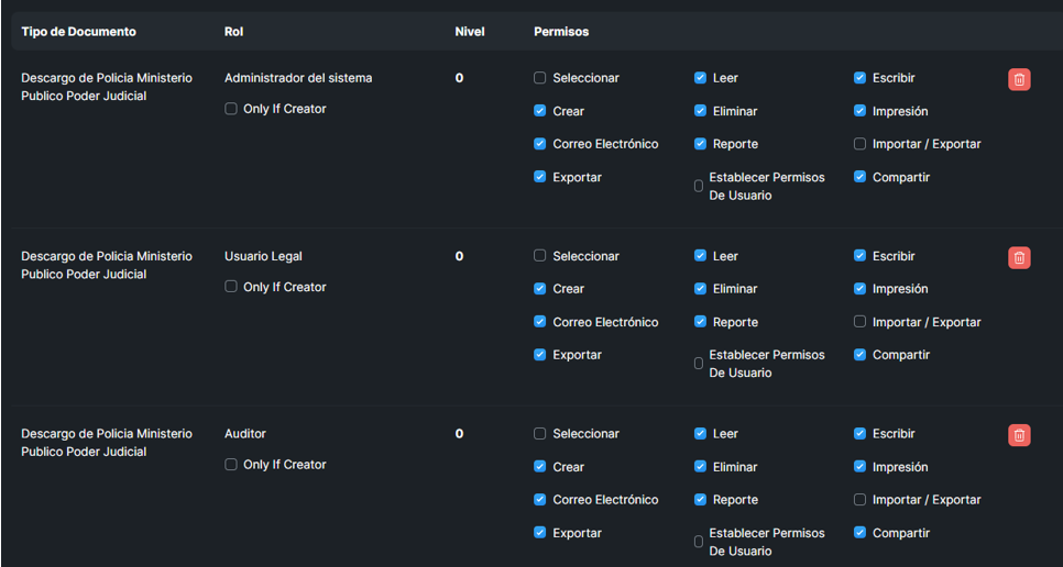 Para todos los módulos los roles necesarios son Administrador del sistema, Usuario Legal, Usuario área legal y Auditor.
