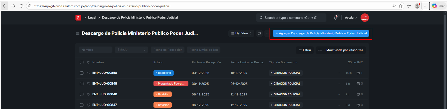 2. Nos dirigimos al botón “Agregar Descargo de Policía Ministerio Publico Poder Judicial”