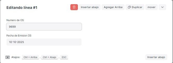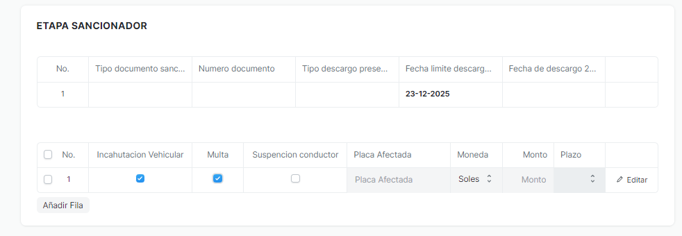 Añades una nueva fila y completas ambas filas, tipo de documento sancionador, numero documento , tipo de descargar presentada, fecha limite de descargo, fecha de descargo 2.