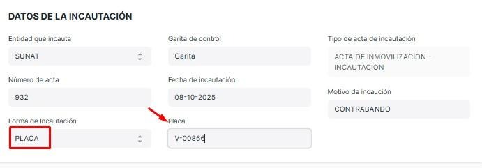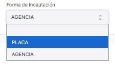 En Forma de Incautación se selecciona entre placa y agencia.