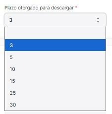 En Plazo otorgado para descargar se selecciona entre 3, 5, 10, 15, 25, 30 de plazo.