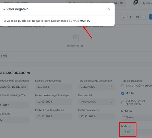 Cuando se intenta registrar con un monto negativo sale la alerta