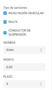Marcar si es incahutacion vehicular, multa, suspension conductor, plaza afectada, moneda, monto, plazo (editable)