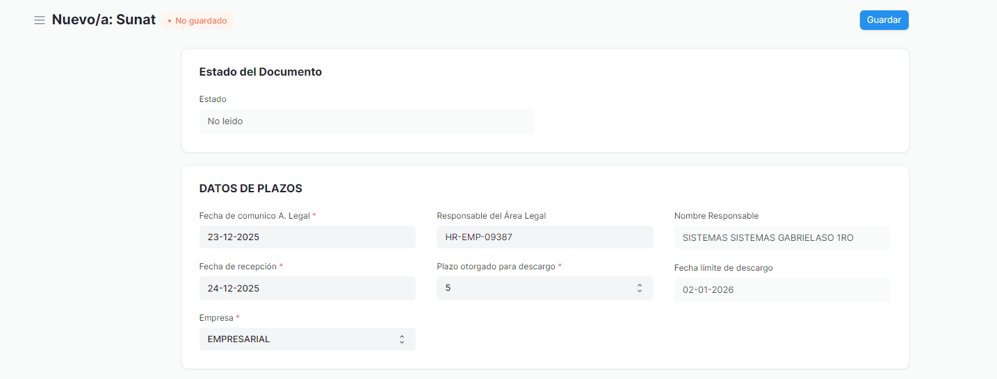 Fecha de comunico A. Legal: se da de manera automática.
