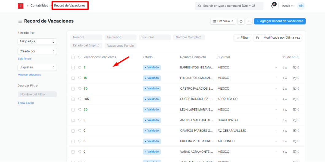 Para acceder a la información individual del empleado, debemos hacer clic en el campo Vacaciones pendientes.