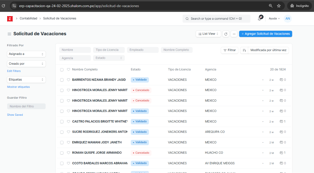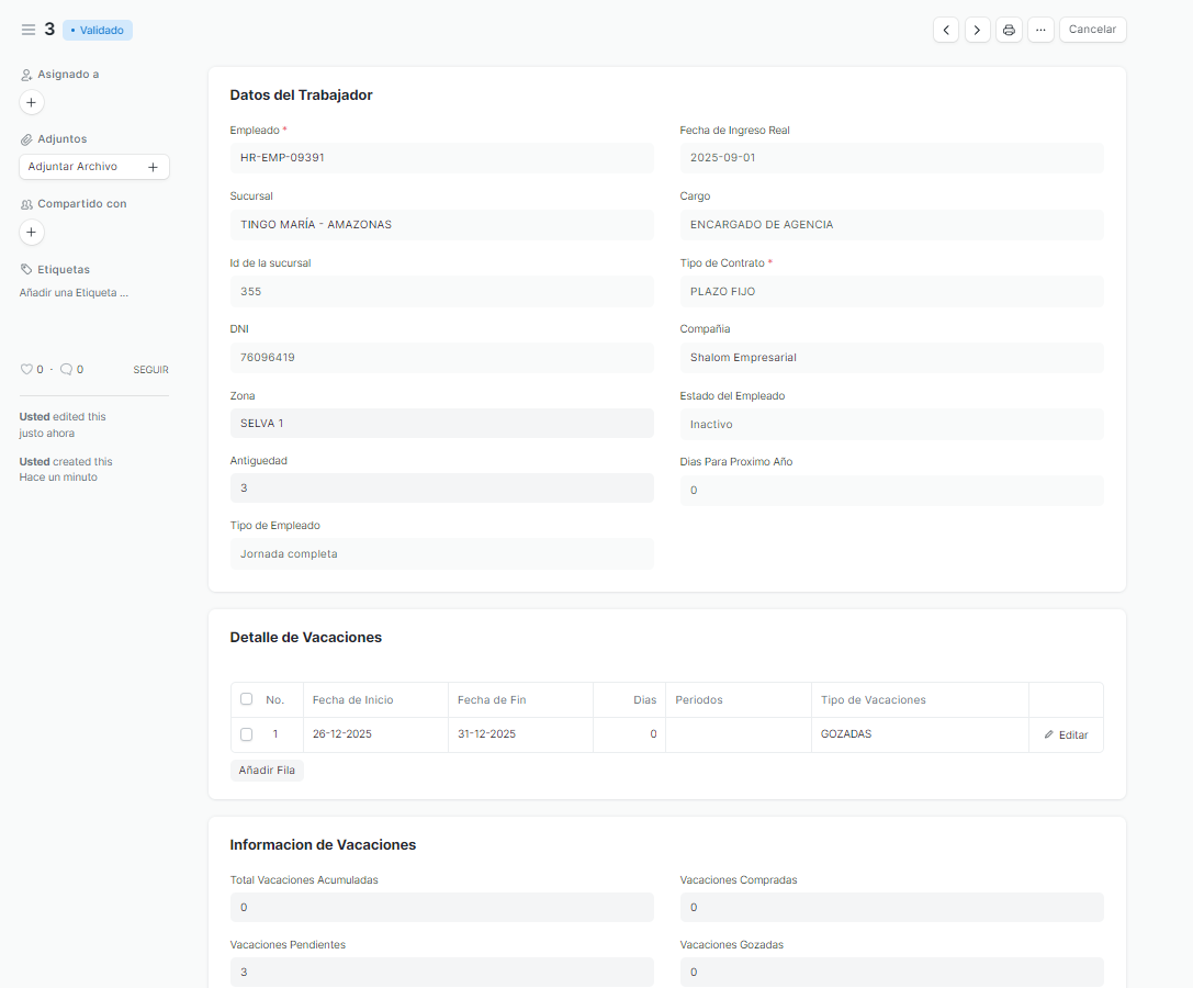 Control de Validación : Al cambiar el estado de la solicitud de Borrador a Validado en el ERP, el sistema genera automáticamente los registros correspondientes en el módulo de asistencia, tomando como referencia la fecha de inicio y fin indicada en la solicitud de licencia.