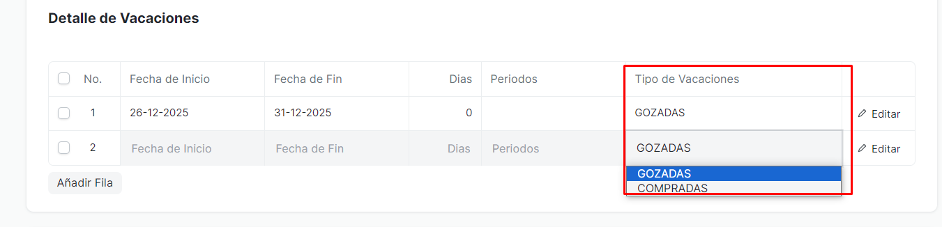 Luego en el siguiente apartado de Detalles de vacaciones se comienza añadiendo una fila y poniendo una fecha de inicio y una fecha de fin, seguido de los dias, periodos, y el tipo de vacaciones que se puede escoger entre gozadas y compradas