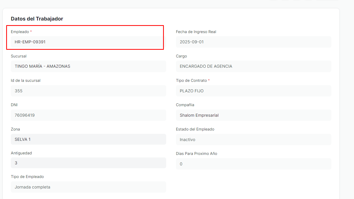 Al colocar el empleado en su campo correspondiente, los demás campos se llenarán automáticamente con la información correspondiente a ese empleado