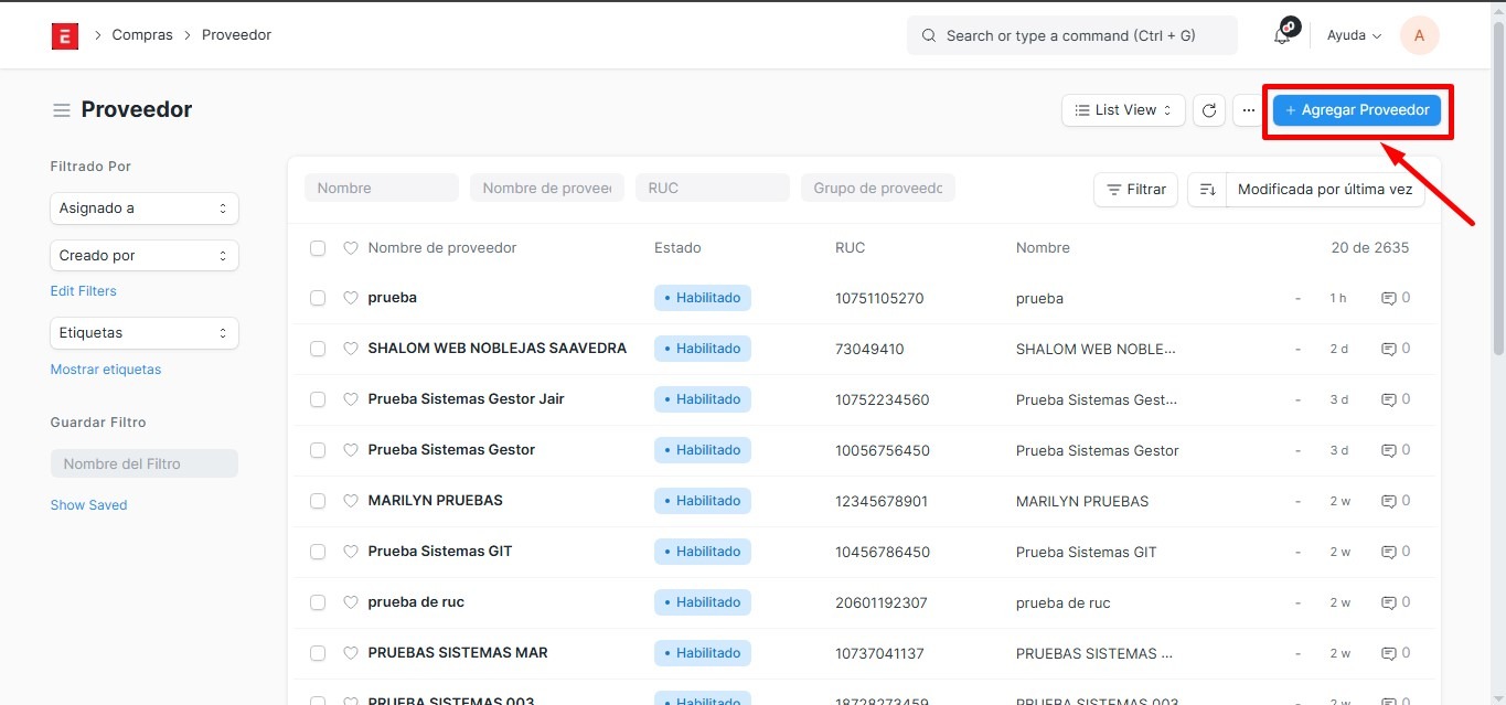 Podemos visualizar que el proveedor ha sido registrado correctamente y ya se encuentra disponible en la lista de proveedores del sistema, lo que nos permitirá crear una solicitud de pago de manera inmediata si así se requiere.