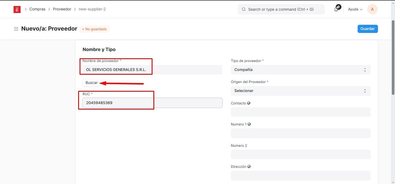 Comenzamos a completar la información de la primera sección del formulario, ingresando el nombre del proveedor y su número de RUC. Podemos utilizar el botón de búsqueda.