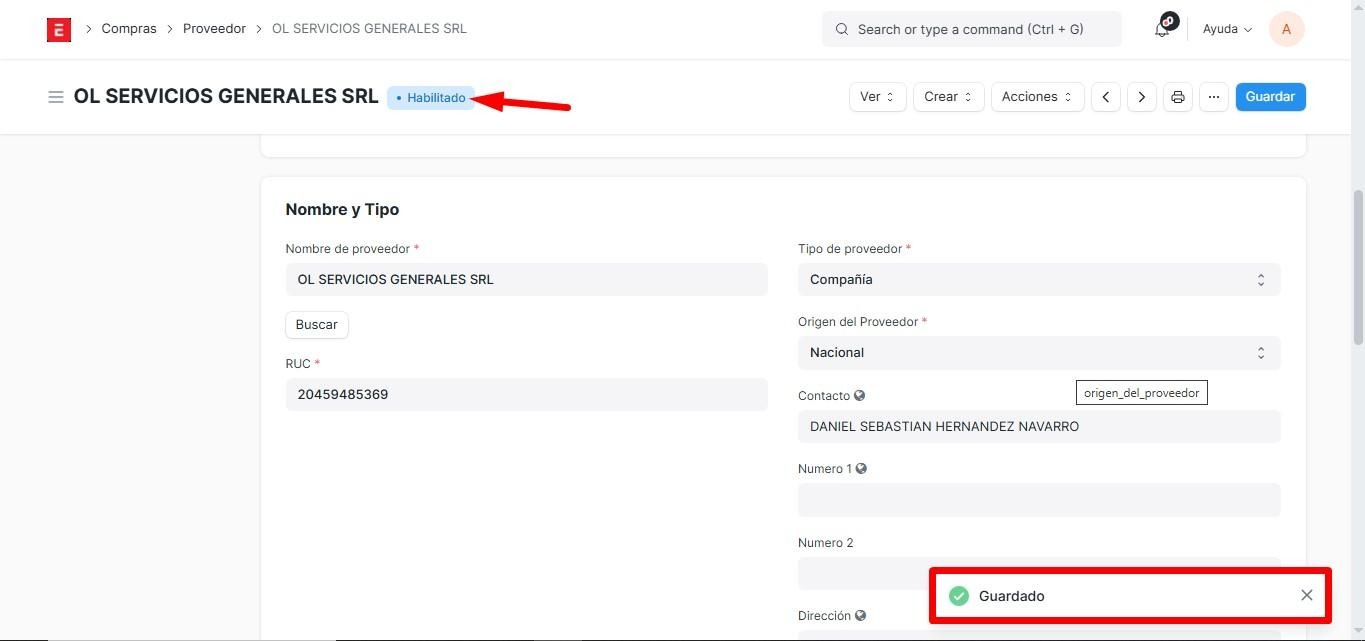 Una vez completado el formulario y guardada la información, el sistema confirmará que los datos fueron registrados correctamente y que el proveedor se encuentra habilitado.