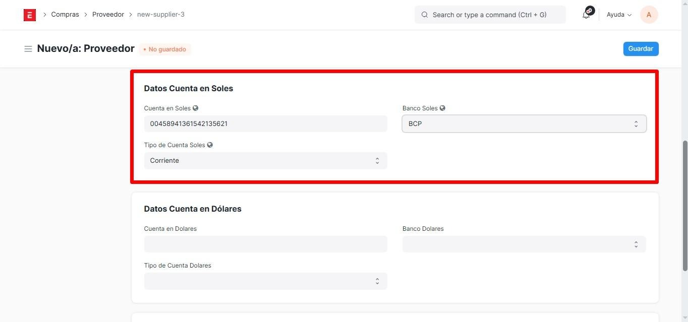 Si deslizamos hacia abajo dentro del formulario, encontraremos la sección “Datos de cuenta en soles” y “Datos de cuenta en dólares”. En este caso, nuestro proveedor cuenta únicamente con una cuenta en soles, por lo que se completará solo esa información.