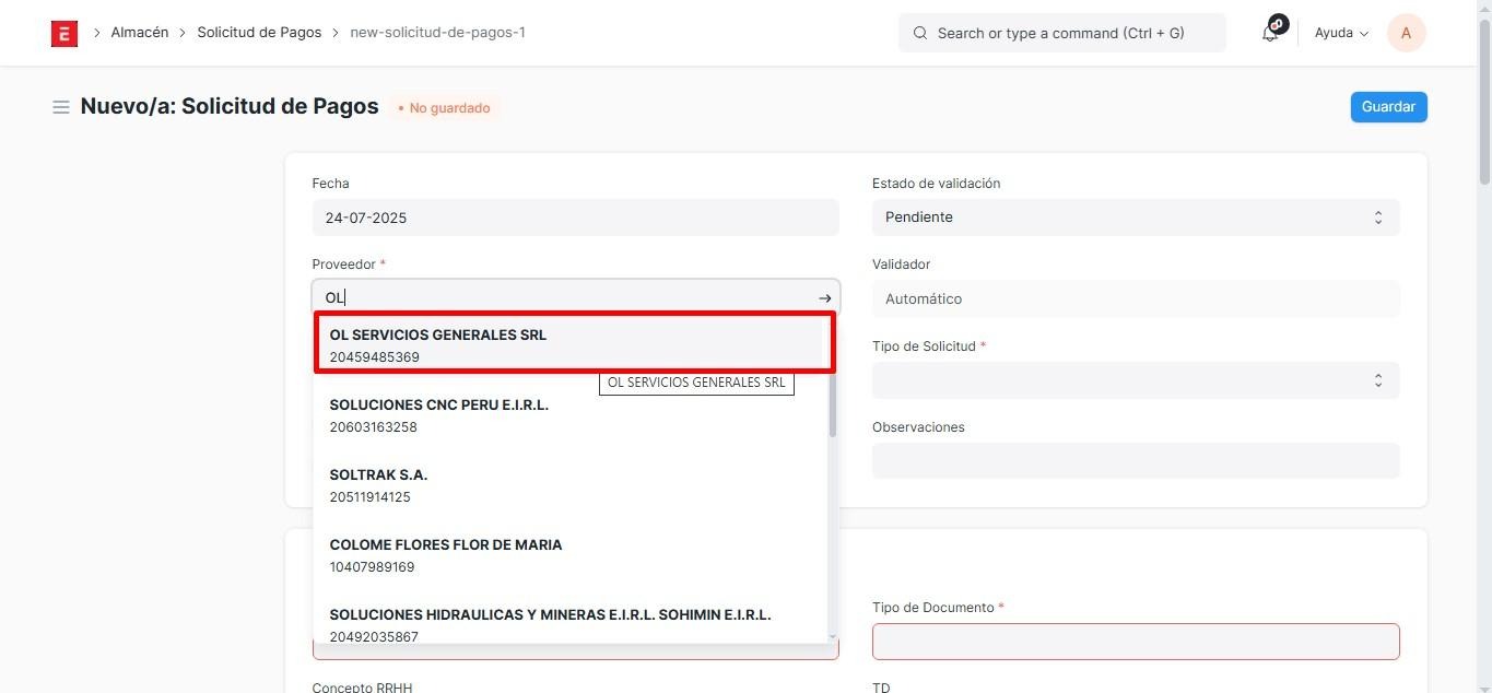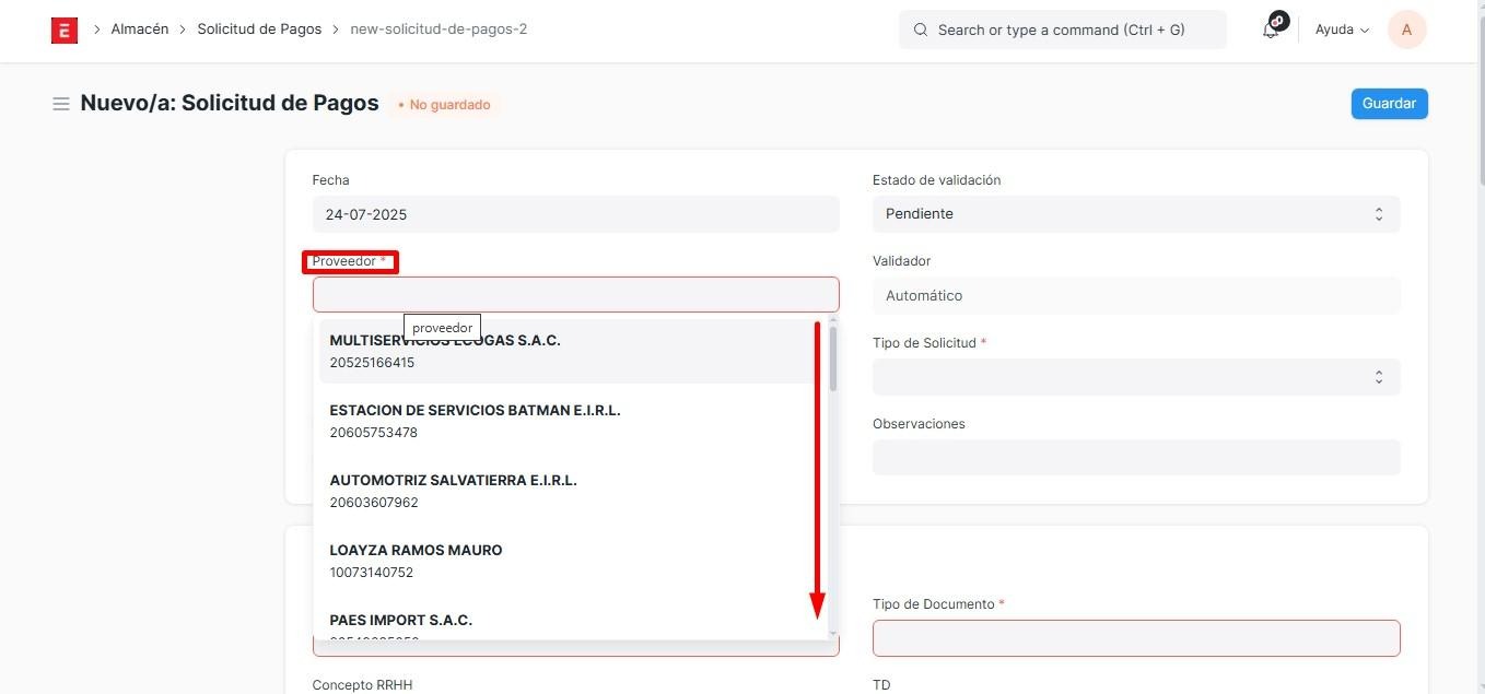En el campo “Proveedor”, se mostrará una lista desplegable con todos los proveedores registrados en el sistema. Podemos buscar al proveedor directamente desde la lista o ingresar manualmente el nombre del nuevo proveedor para seleccionarlo más rápidamente.