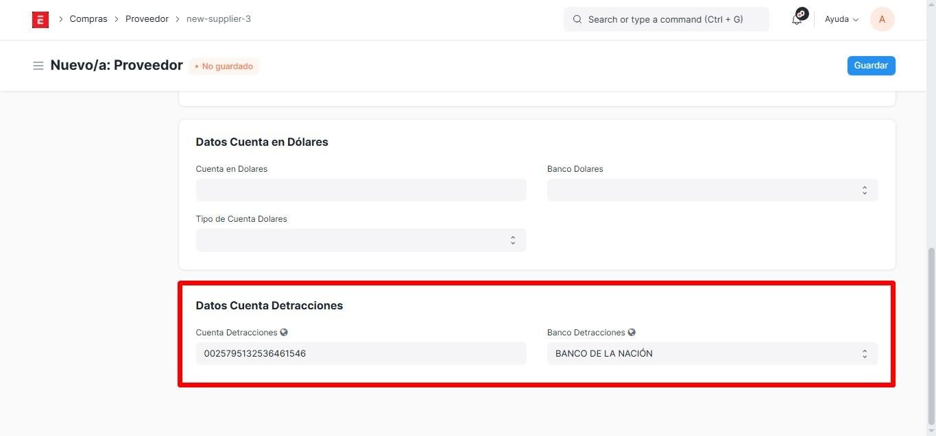 En la sección “Datos de cuenta para detracciones”, ingresamos el número de cuenta y el nombre del banco correspondiente. Esta información es obligatoria solo si se gestionan pagos por detracciones al proveedor.