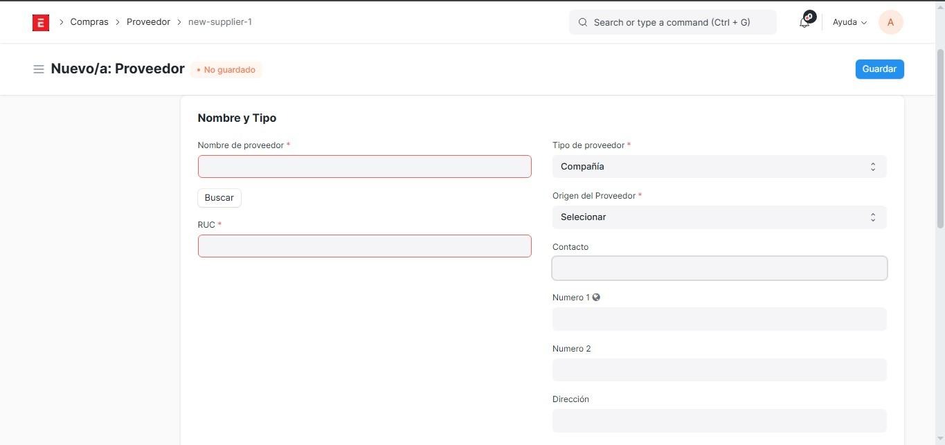 A continuación, el sistema nos dirigirá al formulario de registro, el cual debe ser completado con la información correspondiente al nuevo proveedor que se desea incorporar al sistema.