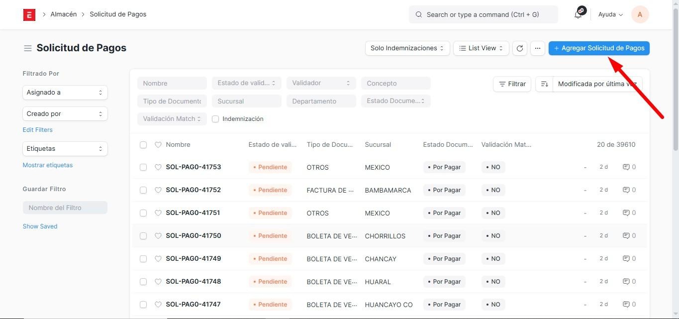 Nos dirigimos al apartado “Solicitud de Pagos” y seleccionamos el botón “Agregar Solicitud de Pago” para iniciar el registro de una nueva solicitud en el sistema.