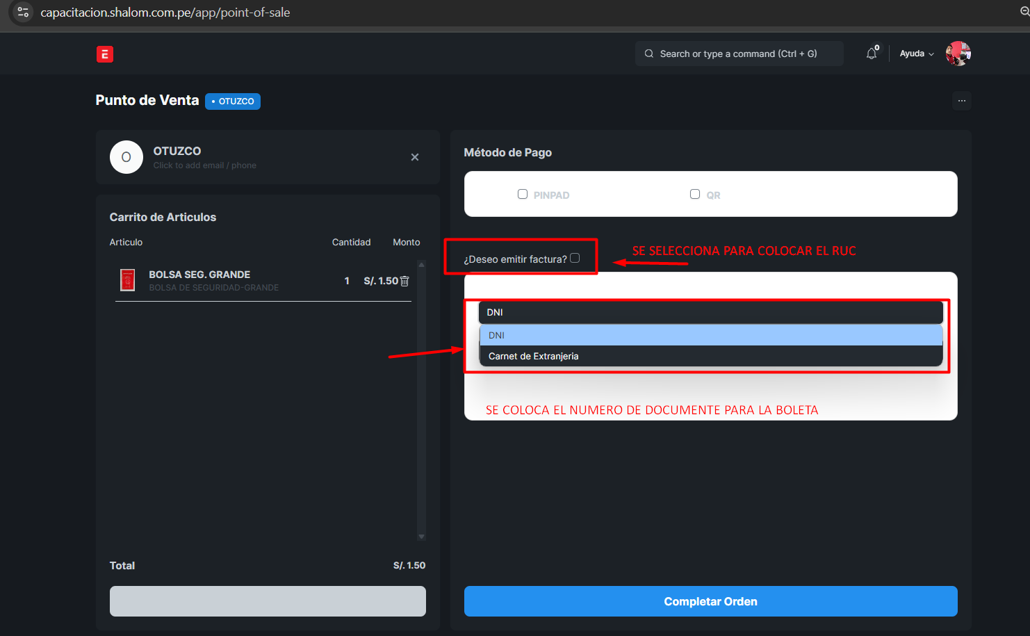 Tipo de comprobante: Se debe seleccionar entre boleta o factura según el tipo de cliente.