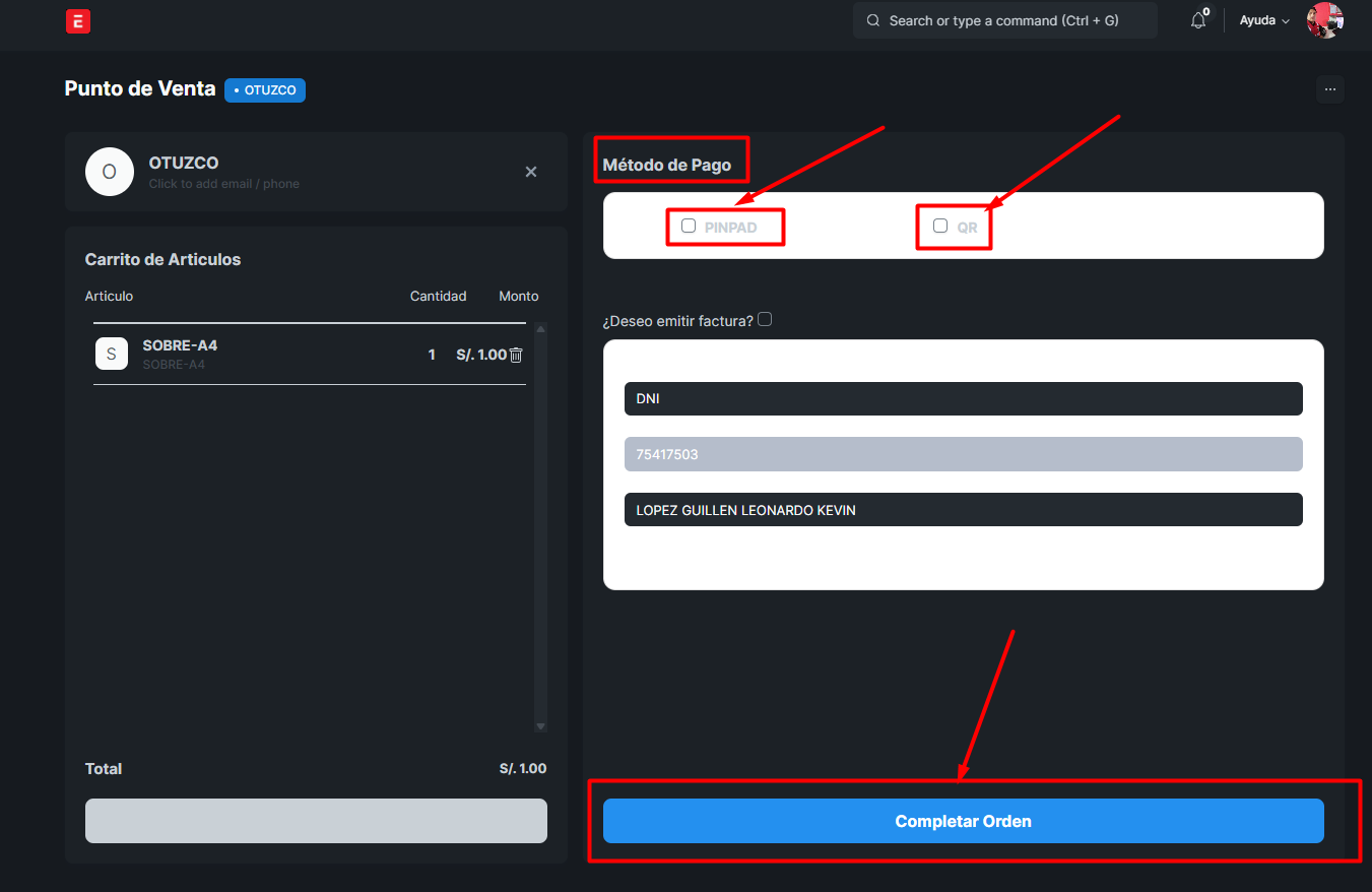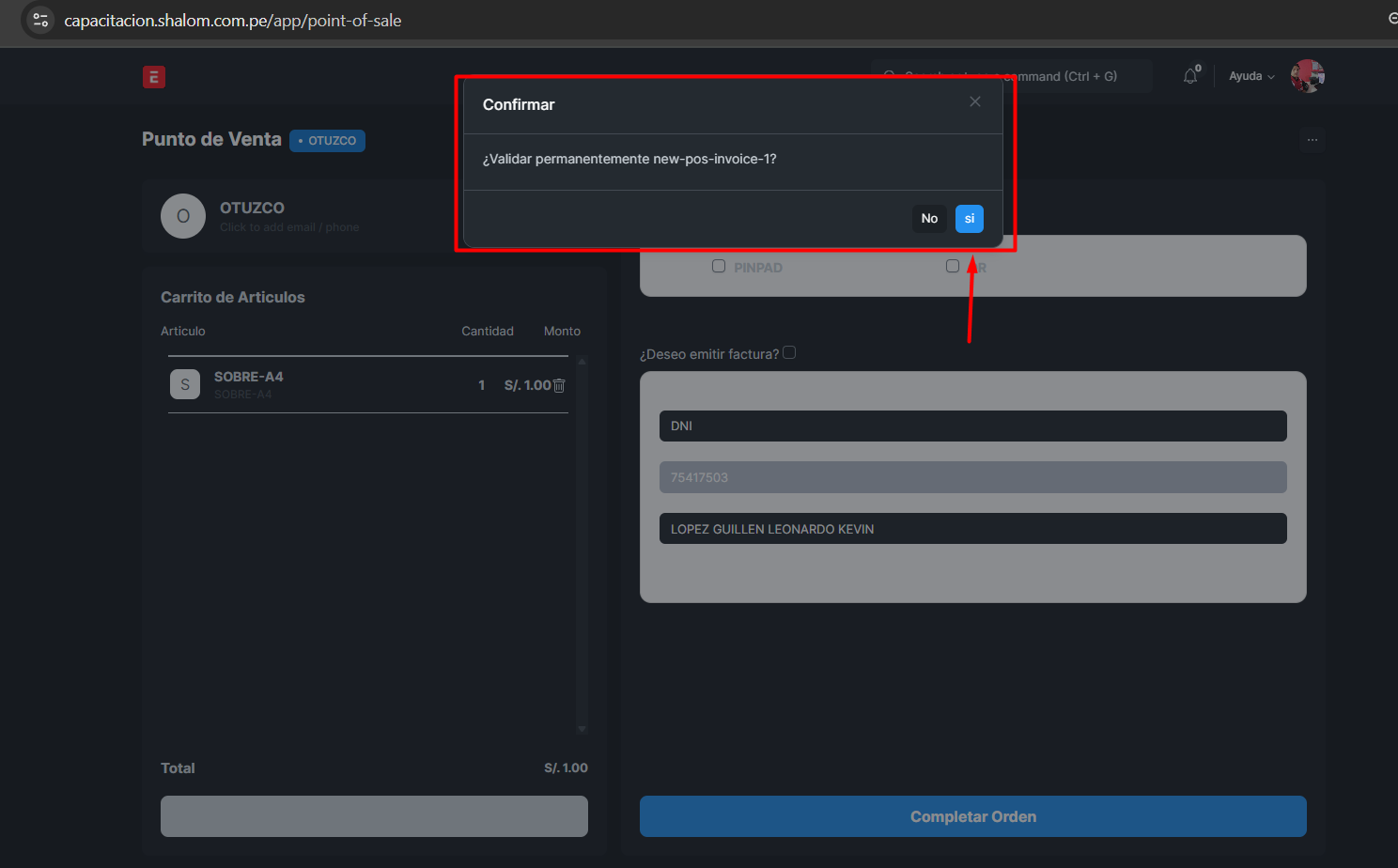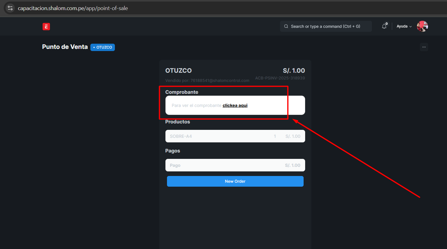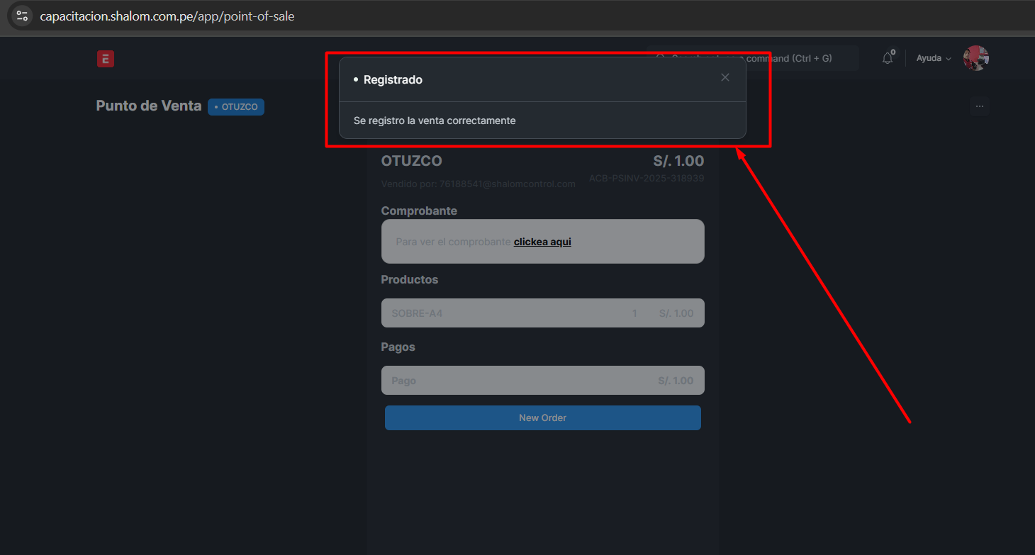 Clic en “Completar orden” →”Confirmar=Si”→ Generación automática de comprobante