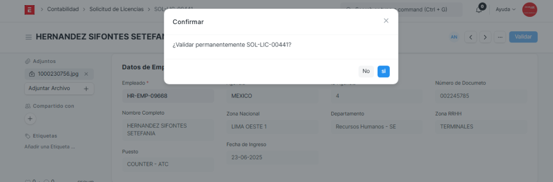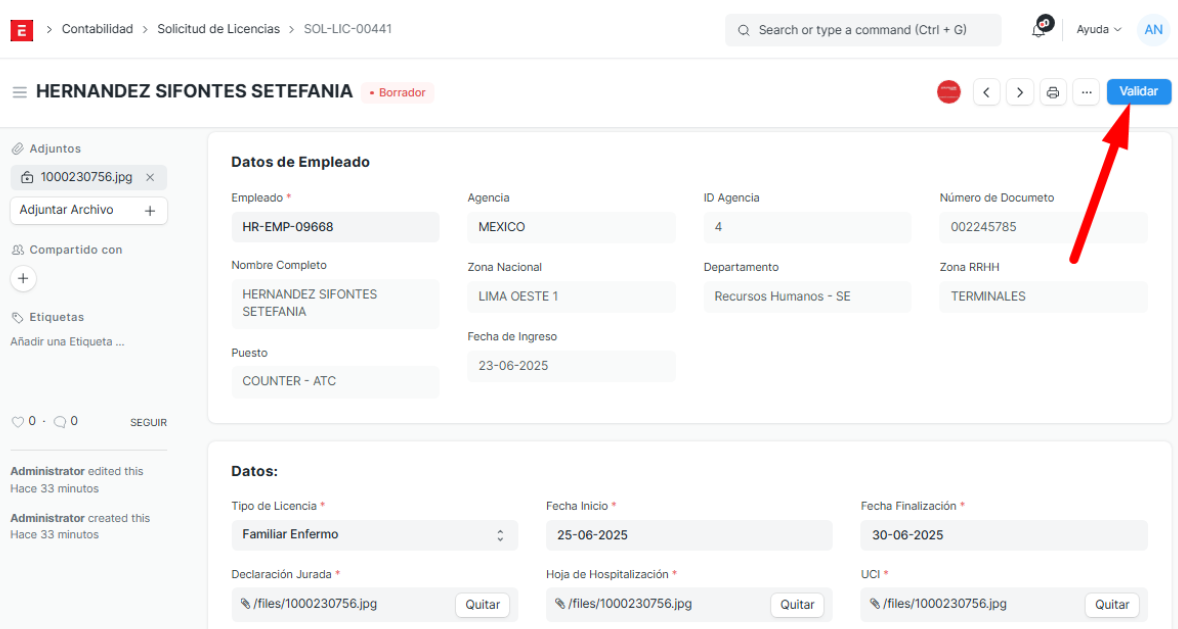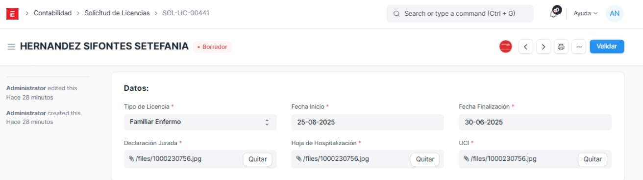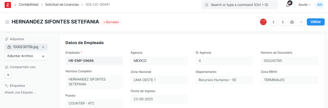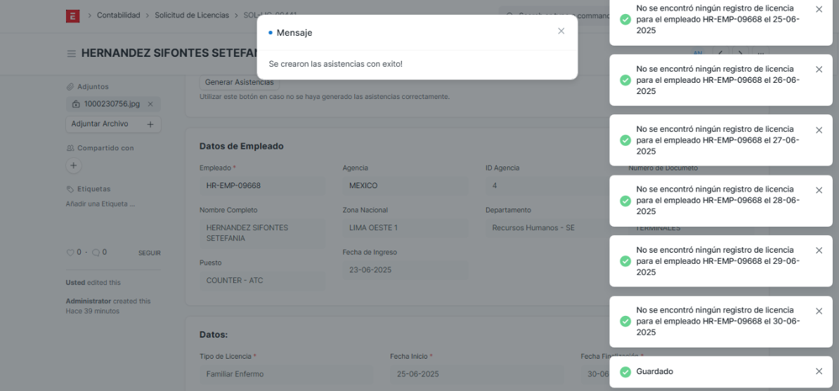 Control de Validación : Al cambiar el estado de la solicitud de Borrador a Validado en el ERP, el sistema genera automáticamente los registros correspondientes en el módulo de asistencia, tomando como referencia la fecha de inicio y fin indicada en la solicitud de licencia.