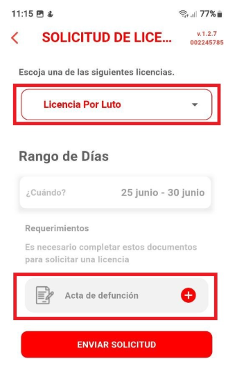 Licencia por Luto: Al seleccionar este tipo de licencia, se deberá registrar el rango de días correspondiente e incluir la documentación requerida.