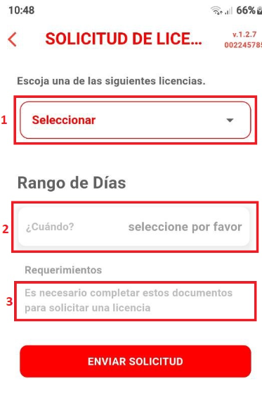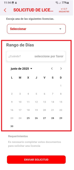 Rango de días : Indicar la fecha de inicio y la fecha de finalización de la licencia.