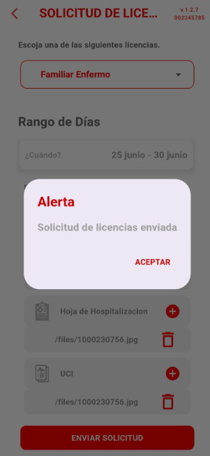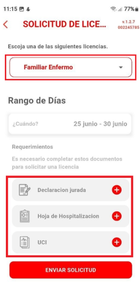 Familiar Enfermo: Al seleccionar este tipo de licencia, se deberá registrar el rango de días correspondiente e incluir la documentación requerida.