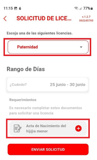 Paternidad: Al seleccionar este tipo de licencia, se deberá registrar el rango de días correspondiente e incluir la documentación requerida.