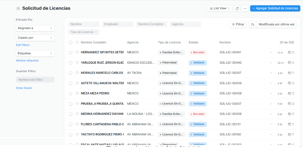 Ingresamos al módulo “Solicitud de Licencias”, donde es posible visualizar todos los registros ingresados desde la APP Shalom Familia, así como el estado correspondiente de cada solicitud según su proceso.