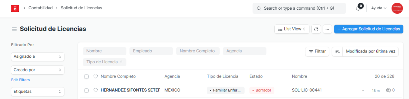 Menú => Contabilidad => Solicitud de Licencias.