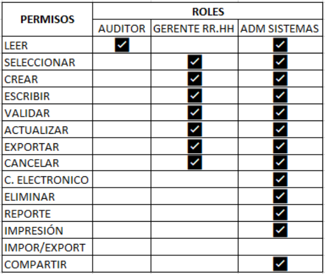 Dicho módulo solo es visible y editable para los roles Gerente RR.HH y Administrador de Sistemas, según los permisos asignados. El rol Auditor únicamente tiene acceso de lectura.