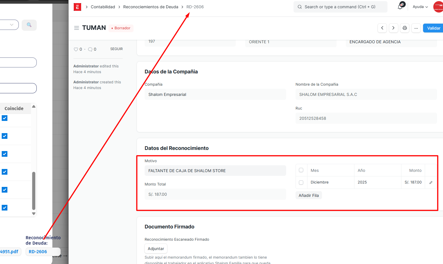 Al empleado seleccionado se le genera su reconocimiento de deuda con el monto exacto que esta en el comprobante