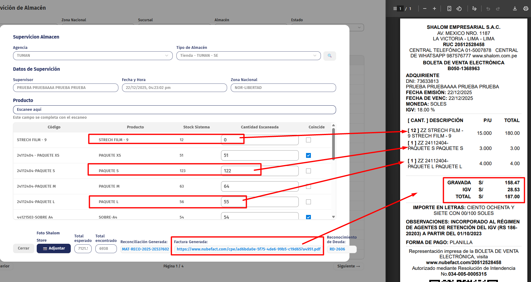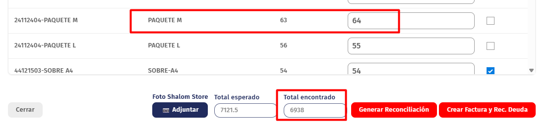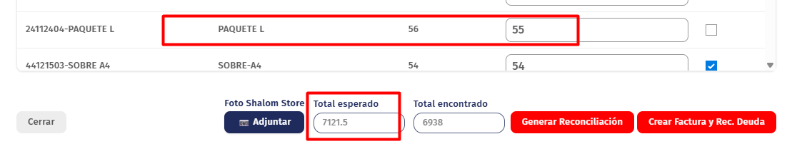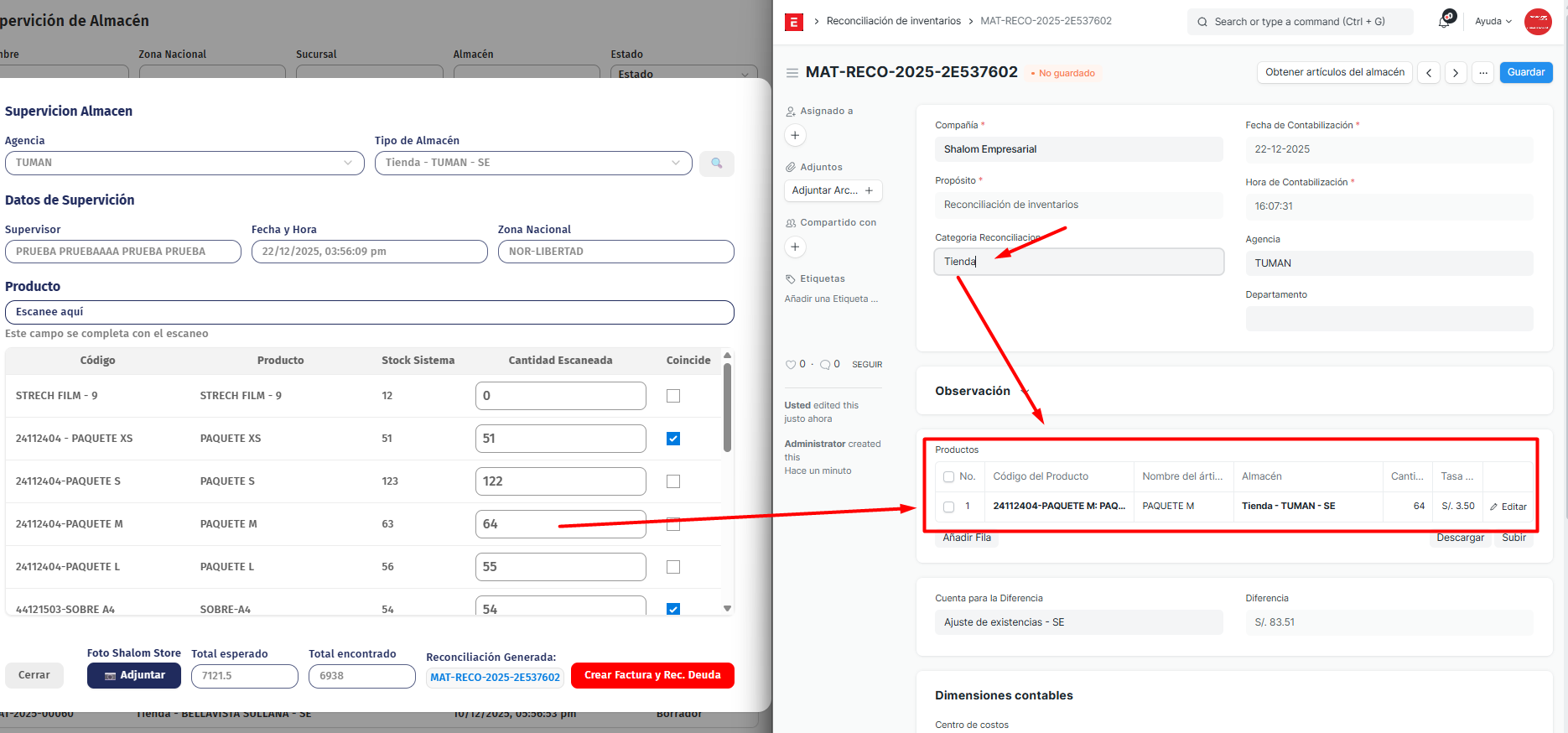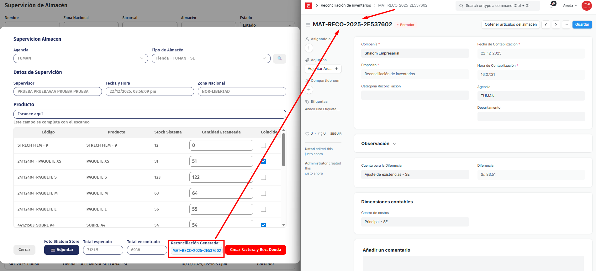 La reconciliación jala la información de las filas de la supervisión de almacén que se encontraron en la columna "CANTIDAD ESCANEADA", Esta información va para el ERP al modulo (https://recursos-humanos-erp.shalom.com.pe/app/stock-reconciliation) este documento se encontrara en estado BORRADOR.