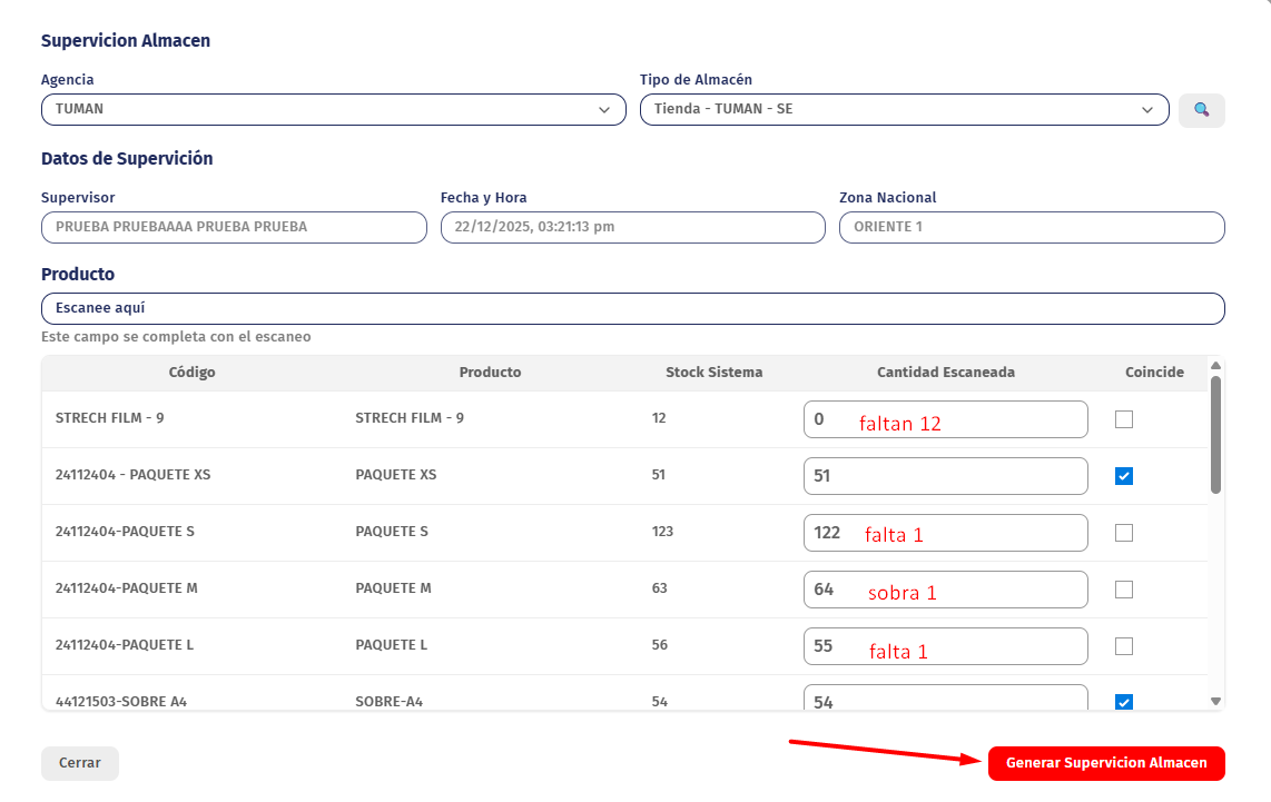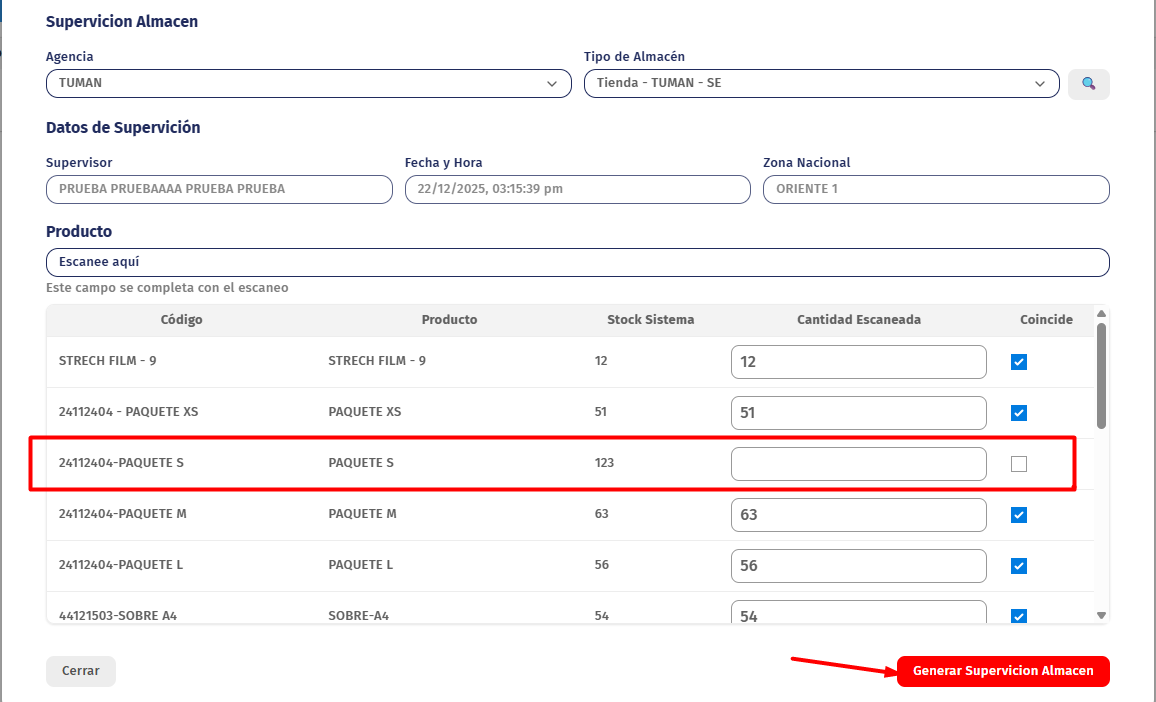 La supervisión en ambas columnas no coinciden "Stock Sistema" - "Cantidad Escaneada" y se clic al botón "Generar Supervisión Almacén" figura la siguiente alerta "Al completar este registro de supervisión de almacén, usted certifica que la información proporcionada es veraz. Proporcionar datos falsos puede resultar en sanciones disciplinarias , según las políticas de la empresa." Le damos al botón SI -> figura la alerta que supervisión exitosa y se mandara a la tabla lista.