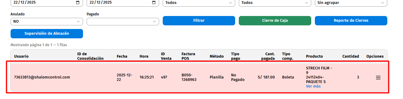 - Campo Total Encontrado =es la suman total de todas las filas de la tabla supervisión como ejemplo tomaremos la fila PAQUETE M el cual en la columna Cantidad Escaneada tiene una cantidad de 64 productos y el precio en la venta es de 3.50 soles (https://recursos-humanos-erp.shalom.com.pe/app/item-price/view/list) lo cual seria 64 * 3.50 = 224 y así sucesiva mente con las filas para obtener el campo total esperado