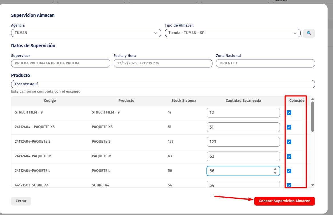 La supervisión en ambas columnas coinciden "Stock Sistema" - "Cantidad Escaneada" y se da click al botón "Generar Supervisión Almacén" figura la siguiente alerta "Al completar este registro de supervisión de almacén, usted certifica que la información proporcionada es veraz. Proporcionar datos falsos puede resultar en sanciones disciplinarias , según las políticas de la empresa." damos a si y se añade en la tabla con estado VALIDADO.
