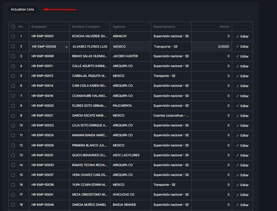 Tener en cuenta que el documento por defecto ya viene con los empleados basados en la fecha de inclusión , el botón lo que hara sera actualizar si hay mas empleados ingresados.