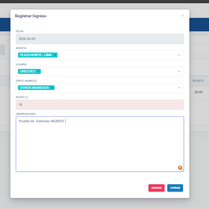 - REGISTRO DE INGRESO : En este apartado se registra OTROS INGRESOS, REINTEGRO POR SEGUROS, VENTA DE ACTIVOS Y ING.CAJA DE RUTA .