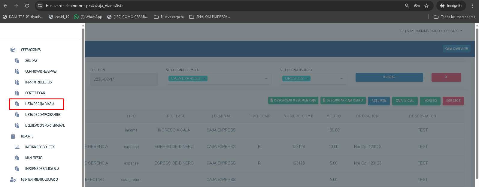 - Resumen de caja diaría: severifica los movimientos del día, caja Inicial, Ingreso Venta que trae de la venta de asientos del bus,otros ingresos es el registro de movimiento , egresos son movimientos que salió , caja diaría el el total de toda la operación del día.