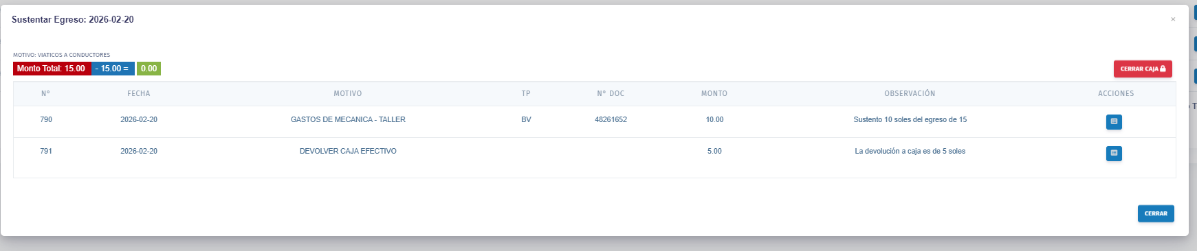 - Cada Egreso Tiene la opción de realizar sustento: El sustento tendrá su motivo de sustento y se procede a agregar los campos correspondientes a la agencia