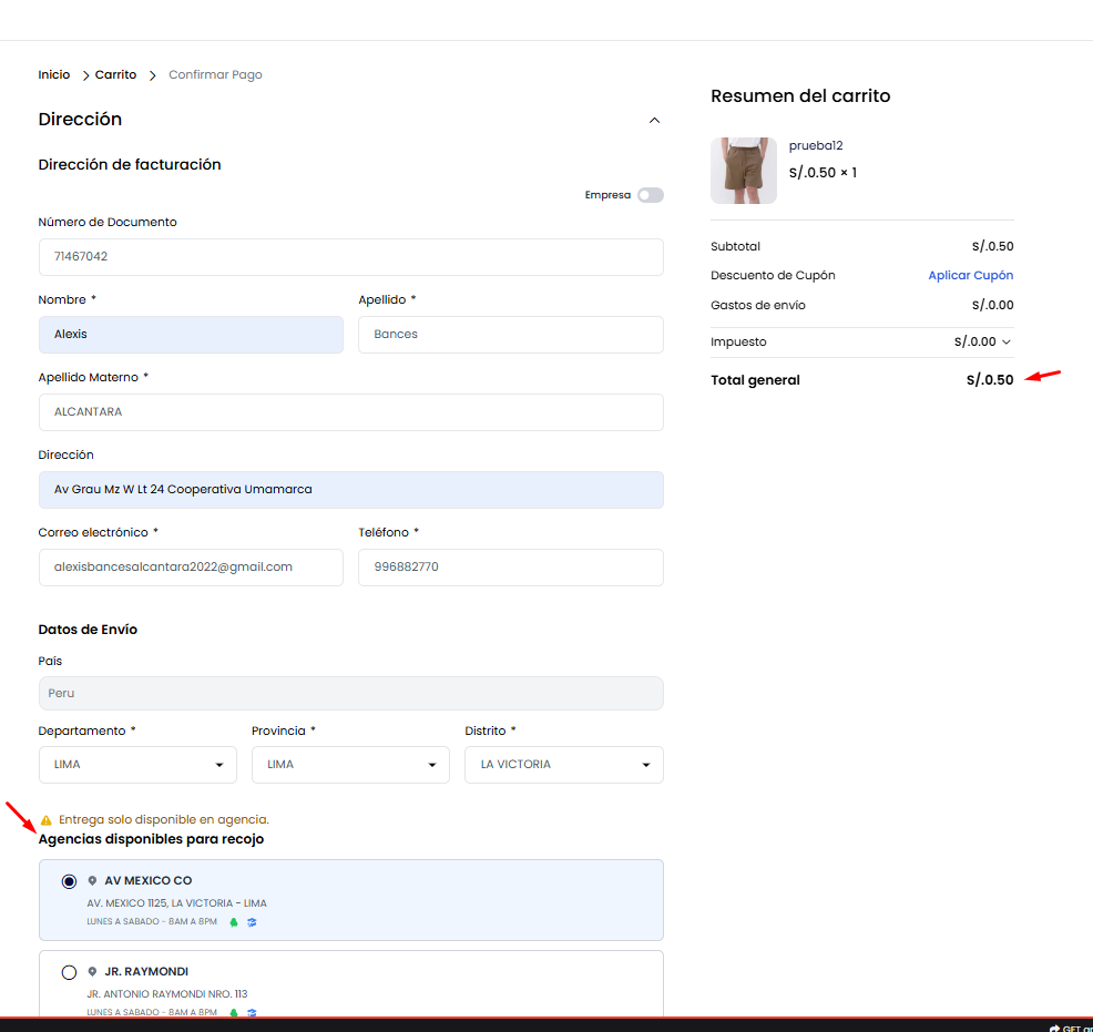 Se completa los campos de compra, cambiamos la agencia ya que la venta