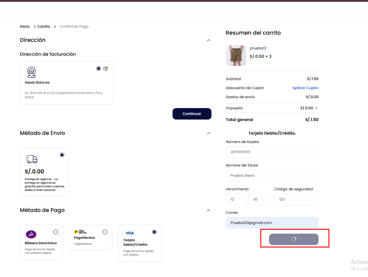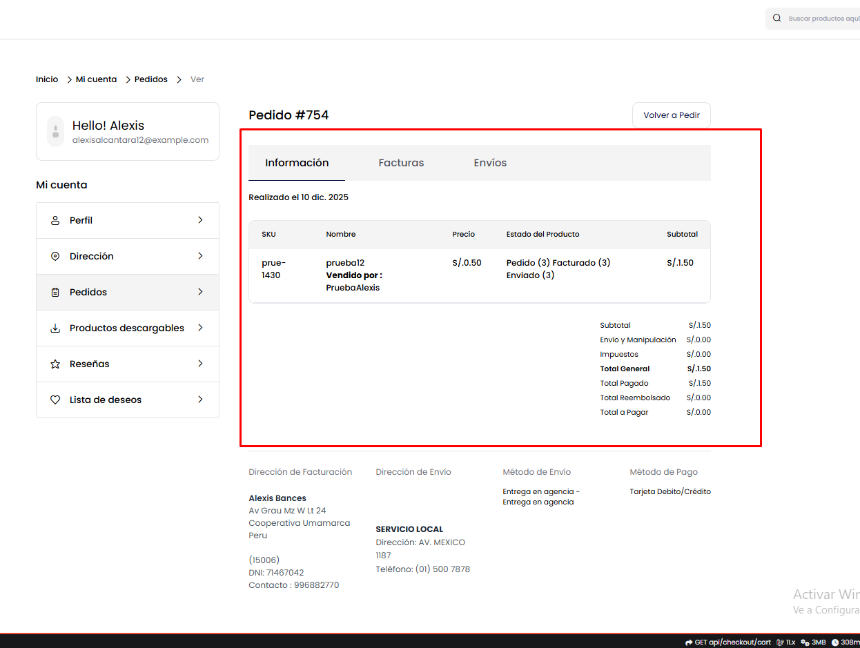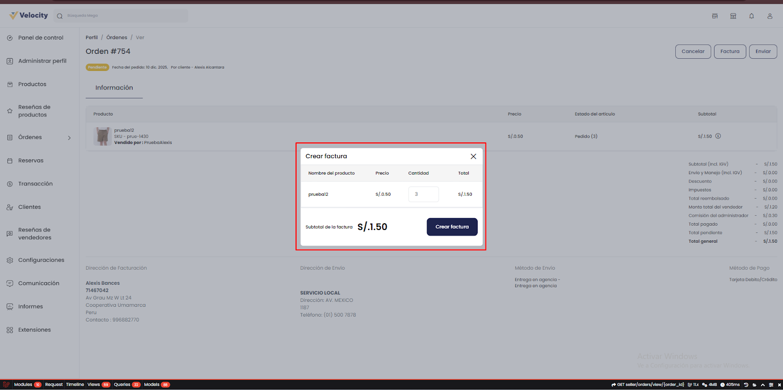 Vamos a la orden generada, le realizamos la facturación correspondiente y se crea el envió